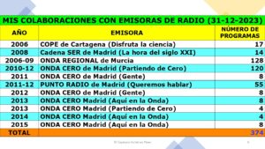Escucha mis colaboraciones científicas, en emisoras de radio (SER, COPE, RNE, ONDA CERO, ONDA REGIONAL DE MURCIA, PUNTO RADIO…).