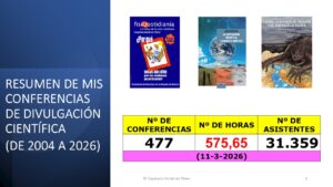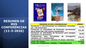 Además, como ponente en cursos y como divulgador científico ha dado 554 conferencias (con un total de 926,05 horas), a distintos colectivos: Profesores, Equipos Directivos, alumnos de Primaria, Secundaria y Universidad, y público en general. De 2004 a 2025 impartió 469 conferencias; y en 2026, lleva 10, como se puede comprobar en la Agenda de su web.